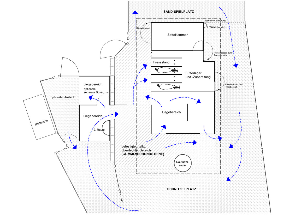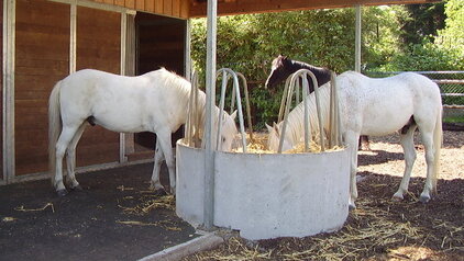 Unsere eigenen Pferde halten wir in einem Gruppenlaufstall, welcher im Jahre 2002 an der internationalen Pferdemesse Equitana in Essen ausgezeichnet wurde.