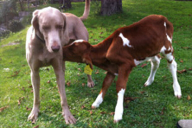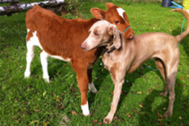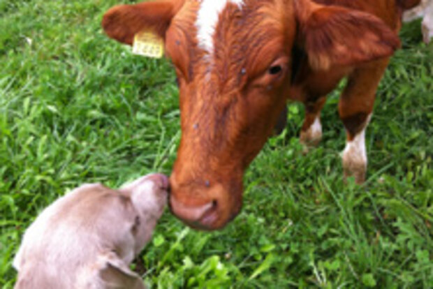 Im August 2013 besuchen wir Eli auf der Aufzuchtweide und Kalb und Hund erkennen sich!